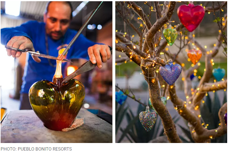 The first time we went to Cabo San Lucas, we noticed these beautiful blown glass hearts around the resort we were staying in, Pueblo Bonito Sunset Beach. It was explained to us that the resort had partnered with a local artist to repurpose the glass the resort had previously been throwing into the garbage. Israel Bautista now takes the castoff glass and turns them into stunningly beautiful glass hearts. The hearts themselves come in a wide variety of colors, styles, and sizes. They are incredibly eye-catching, especially the way they reflect light.
